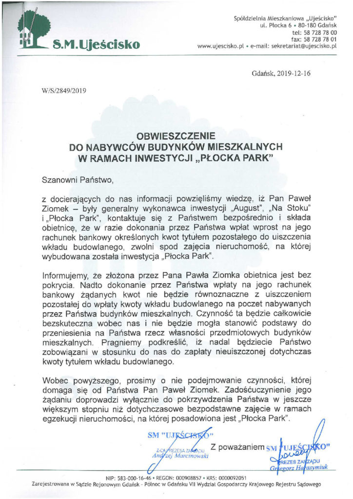Obwieszczenie do nabywców budynków mieszkalnych w ramach inwestycji Płocka Park