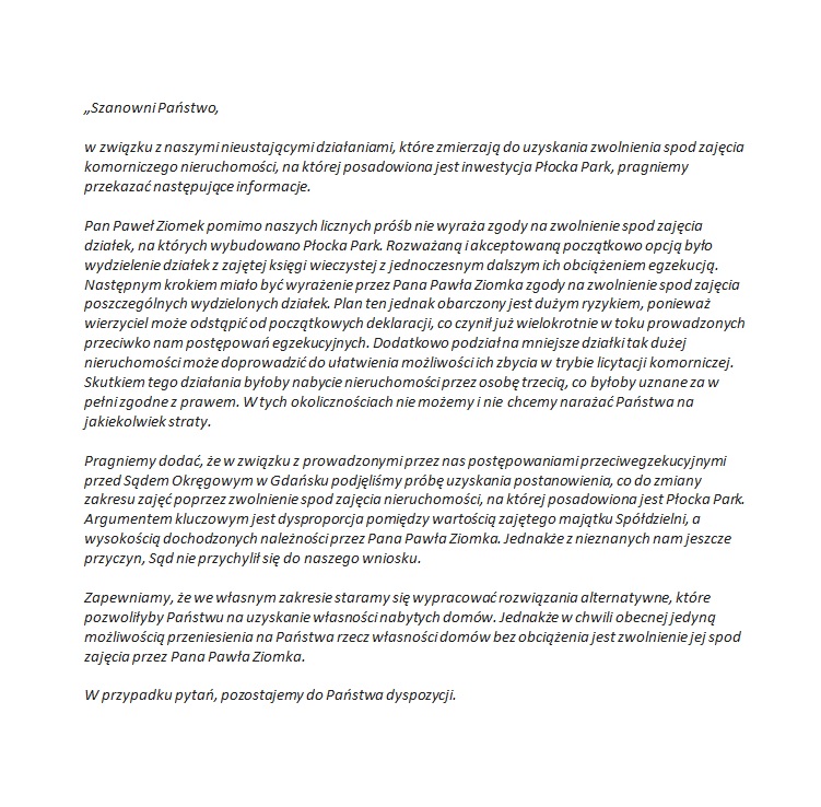 Oświadczenie dla nabywców inwestycji Płocka Park