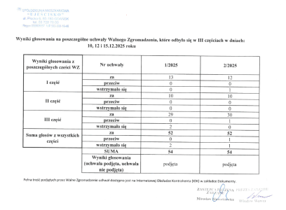 WYNIKI GŁOSOWANIA NA POSZCZEGÓLNE UCHWAŁY WALNEGO ZGROMADZENIA, KTÓRE ODBYŁO SIĘ W III CZĘŚCIACH W DNIACH 10, 12 i 15.12.2025R.